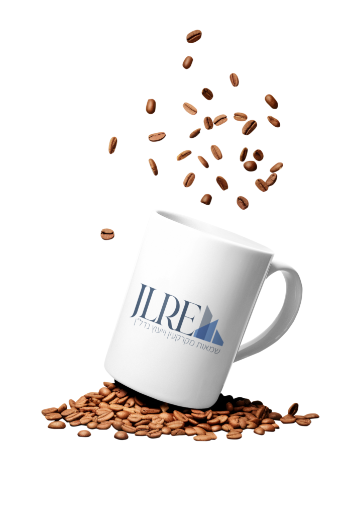 כוס קפה עם לוגו JLRE, שמציעה ללקוחות פגישה מקצועית עם שירותי שמאות מקרקעין וייעוץ.